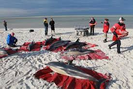 Se ven a decenas de personas arrastrando los mamíferos por la cola, en un esfuerzo para que volvieran a aguas más profundas. El esfuerzo, el pasado lunes fue un éxito. Después de que todos los delfines fueran rescatados, la multitud de espectadores rompieron en vítores.